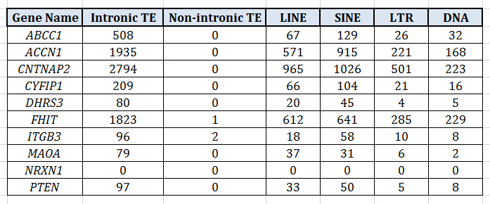 One thing which I find really interesting about TEs is that, by and large, they tend to be relegated to intronic regions. The table below is a few examples pulled from my own work, showing the four major categories of TEs in humans and the number of TEs in intronic regions of a given gene. A correlation between the categories, LINE and SINE, is to be somewhat expected since (autonomous) LINEs produce protein products which make it possible for (nonautonomous) SINEs to insert themselves into the DNA. But note that the LINEs, SINEs, LTRs, and DNA tranposons all correlate well with one another. To me it suggests there is something unique to these intronic regions that, when they attract one type of mobile element, they generally attract all of them.