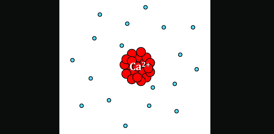 An example of a calcium ion (Ca2+) in which the atom has lost its two outermost electrons, giving it a +2 charge.