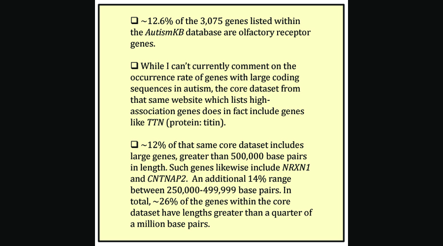 Starting to sound familiar? Many of the same genes which are turning up as false positives in cancer studies are also turning up in autism research. The difference is that we in the autism research community haven’t yet addressed whether these genes are false positives or not.