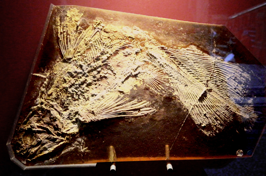 The impressive fossilized, Coelacanth, which is an evolutionary intermediate between ray-limbed fish and lobe-finned fish/tetrapods: