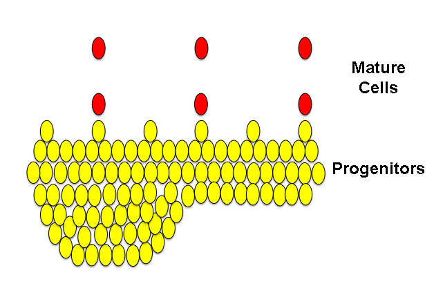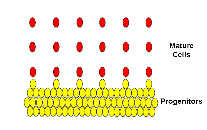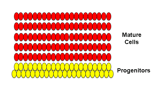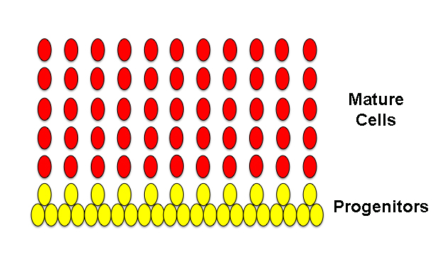 Okay, so in order to simplify this as much as possible, below is a prototype I’ve put together to represent “normal tissue”. This can be almost any kind of epithelial-like tissue you like; the way they divide and mature are all very similar. In this case, think of this as a prototypical brain, specifically the cortex, with the yellow ovals representing neural stem cells or progenitors and the red ovals representing differentiated or mature neurons. This diagram is highly simplified but it gets to some basic concepts. In this case, each of the second-layer progenitors have produced the neurons for a given column; therefore, the number of columns are reflected in the number of progenitors. Remember this concept for the rest of the following images.