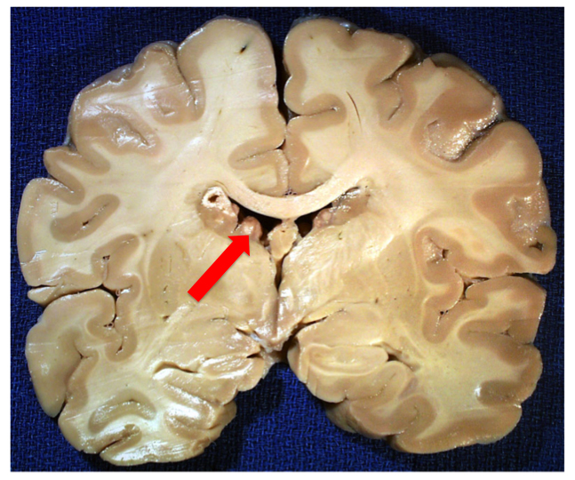 A coronal section of a brain from someone with Tuberous Sclerosis, a syndromic form of autism that is usually a result of a loss-of-function mutation in either the TSC1 or TSC2 genes and which causes upregulation of mTOR pathway activity, leading to increased cell growth and proliferation. In this case, you can easily see the tuberous growths lining the lateral ventricles. Image borrowed from here