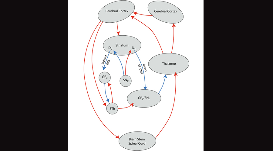 Illustration of the striatal thalamocortical loop, in which the striatum in the limbic system feeds into the thalamus in both a direct and indirect manner, and finally into the neocortex. Image borrowed from here.
