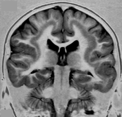 So, basically he suggests that it is better to avoid the use of the term “laminar” altogether, because even though subcortical “laminar” heterotopias may have some sort of laminar or layered appearance, they are less “banded” than the true band heterotopia and do occasionally degrade into a more nodular form. Below is a picture of a subcortical band heterotopia.