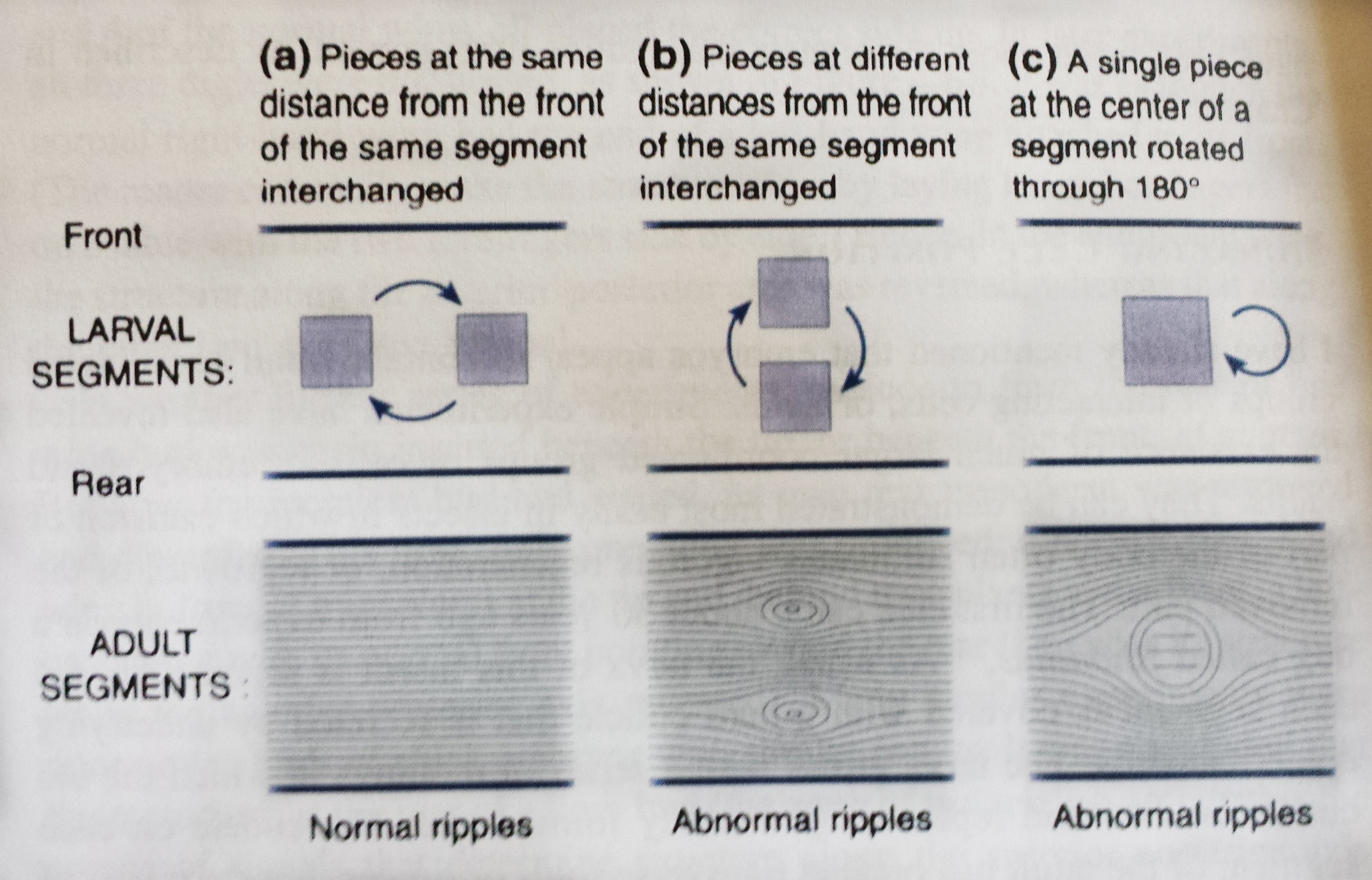 In (a) illustrated above, two squares of ectoderm from the same anterior-posterior plane in the body of the embryonic insect were switched, without any rotations to the tissue. In this instance, the tissue healed normally and looked relatively indiscernible from untreated insects. In illustration (b), however, the researchers took two segments of ectoderm from different planes within the anterior-posterior axis and switched them. In these insects, not only did healing occur, but the grafts caused an expansion of cell growth surrounding the segments. Likewise, as illustrated in (c), when a single segment of tissue ectoderm was rotated 180 degrees, there was an expansive growth surrounding the graft.