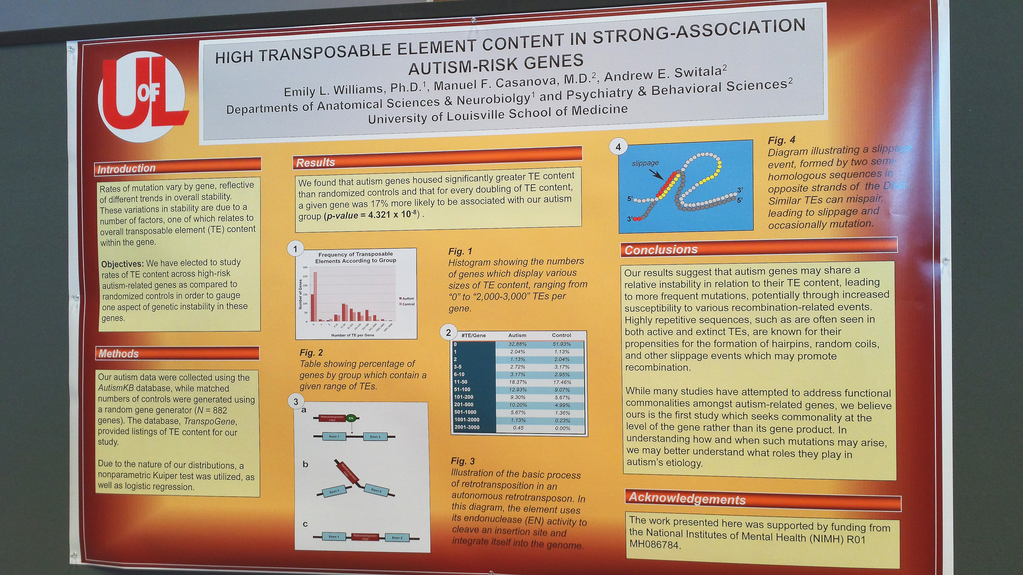 This year I had the great pleasure to present my own preliminary work on transposable element content in high-risk autism genes. Many of you probably already have some idea of what that research is about, but just in case, read here for a review. And below is an image of the poster.