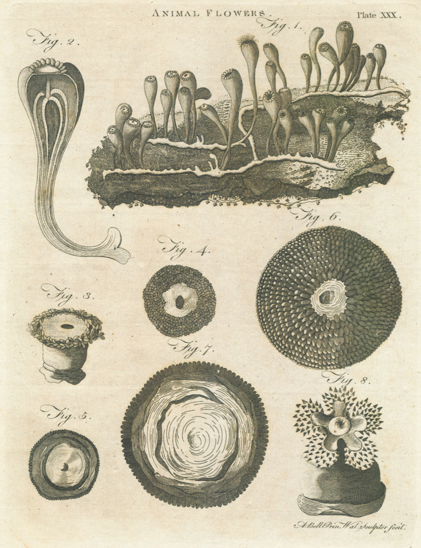 I recently purchased a print off of eBay taken from the 1st American edition of the Encyclopedia Britannica, printed in 1797. Having been brushing up on my natural history over the last year, the title of this print immediately caught my attention and therefore I had to purchase it, especially considering how inexpensive and in what good condition it was. The print was titled, “ANIMAL FLOWERS” (below).