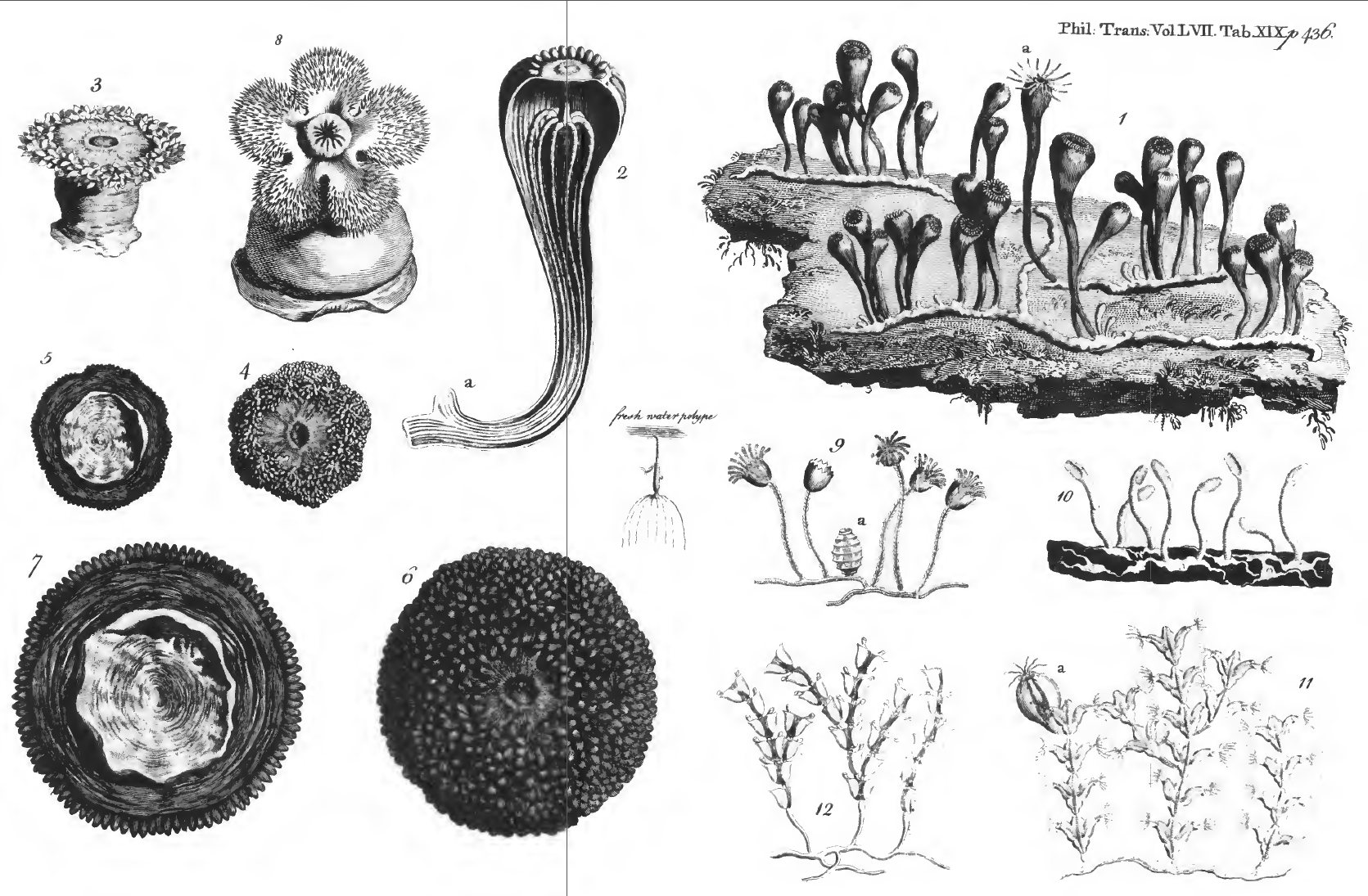 Otherwise known as “animal flowers”, these sea anemones baffled the Victorians with a combination of flower-like and animal-like characteristics. While their general appearance suggests that of a plant, their capacity for movement is decidedly animal-like in fashion. After all, plants can of course move, but with the exception of a few carnivorous examples, plants move via growth, e.g., towards a light source, which is not immediately observable. Meanwhile, the “polyps” and “animal flowers” are capable of immediate and observable movements in reaction to some stimulus. In short, they have primitive forms of striated muscle, which allow rapid contraction [1]. In addition, their incredible capacity for regeneration of injured “limbs” baffled natural philosophers far and wide and was the subject of extensive study, especially by Abraham Trembley.