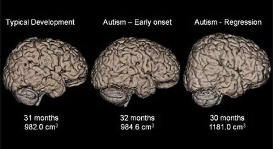 Image showing larger brain volume in the regressive form of autism. Image borrowed from here.