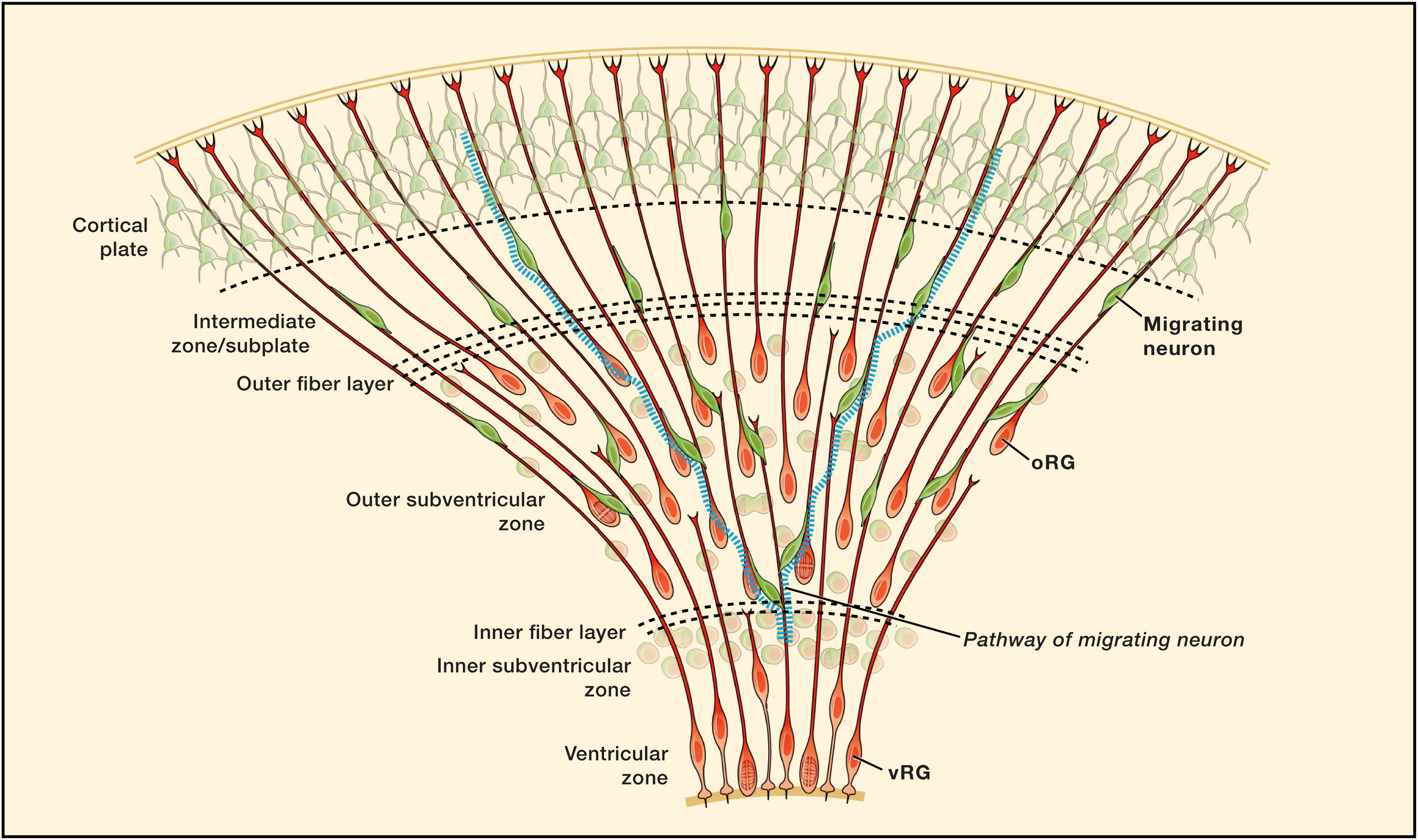 Illustration of neurogenesis in the developing neocortex of the human brain. Newborn neurons are produced from the ventricular and subventricular zones and then migrate to their final destinations in the cortical plate. Borrowed from Lui et al. (2011).