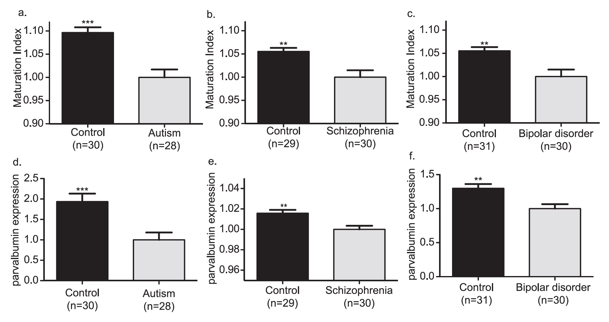 Figure from Gandal et al. (2012). Panels a-c show the maturation index, reflective of gene profiles relevant to interneuronal maturation across autism, schizophrenia, and bipolar. Panels d-f show parvalbumin expression levels in the three conditions.