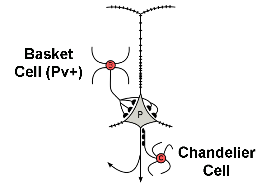 Two examples of interneurons: the parvalbumin-positive (Pv+) basket cell, and the chandelier cell. Both synapse onto the excitatory pyramidal cell and help to regulate its activity.