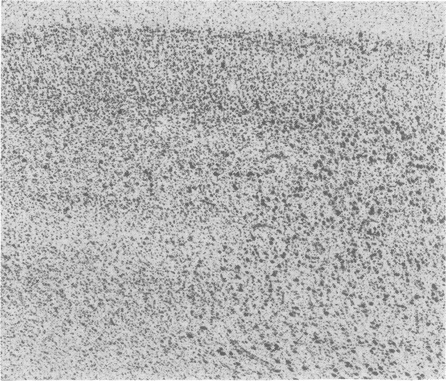 A focal cortical dysplasia in a section of tissue surgically removed from an epileptic patient (Taylor & Falconer, 1971). Note the abnormal arrangement of larger neurons in the lower right-hand corner of the image, with normal-looking cortex adjacent to it.