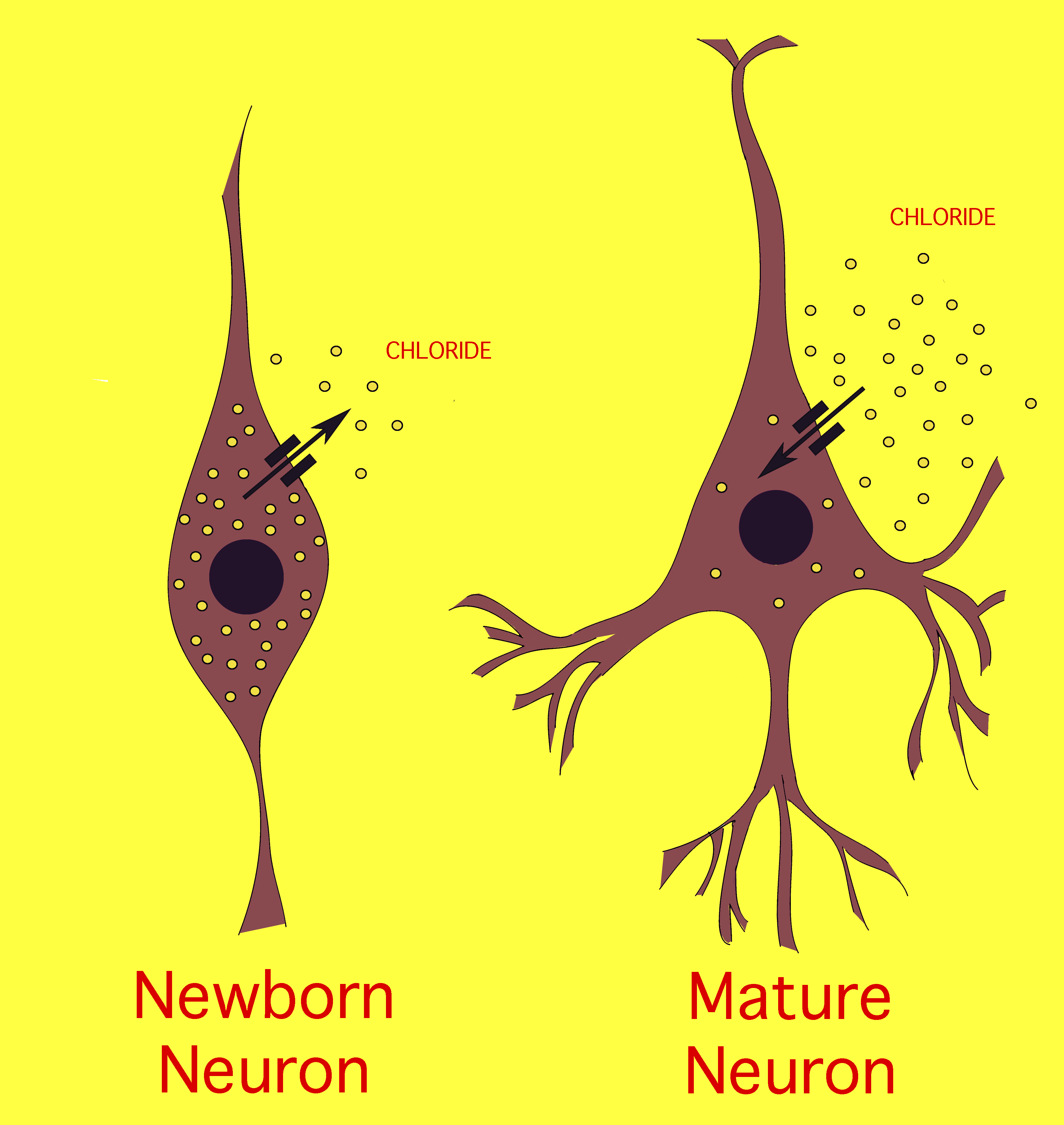 Because the GABA receptors control the gating of chloride into and out of the cell, a cell’s reaction to GABA docking on its receptor depends on how much of the negatively-charged chloride is inside compared to outside the cell. In immature neurons, more chloride resides within the cell and thus when GABA receptor activation causes chloride channels to open, chloride escapes into the extracellular space, increasing the positive charge of the neuron and lowering the stimulus threshold at which that neuron can fire. In essence, excitatory GABA gives a pyramidal neuron an itchy trigger finger.