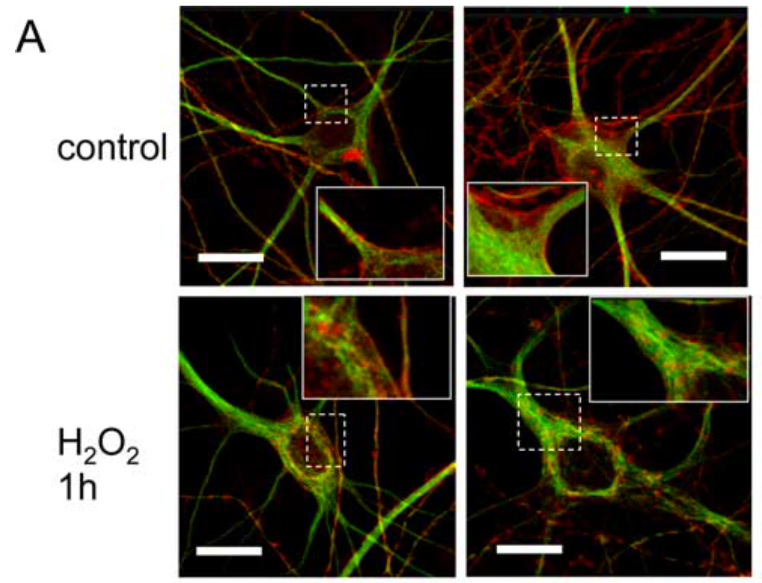 Image from Wake et al. (2007) showing the localizations of KCC2 (red) in control (upper panels) and hydrogen peroxide-stressed neurons (lower panels). Note that there is comparatively less red KCC2 staining at the cell surface in the stressed cells.