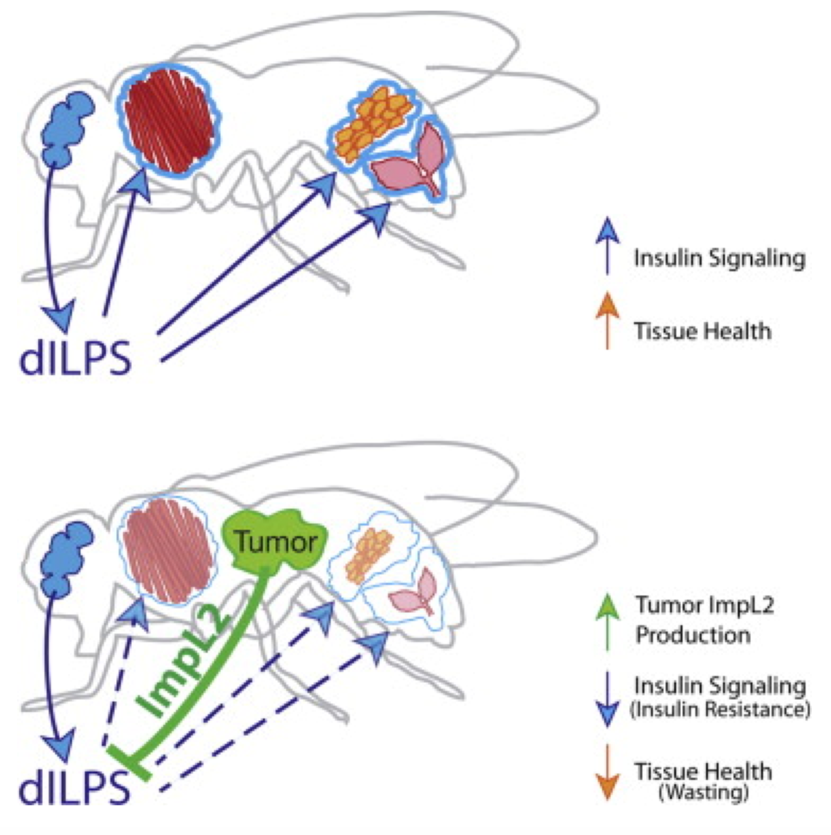 What each of the teams found with their respective fruit fly cancer models was that cachexia was driven primarily by a reduction in insulin signaling, leading to system-wide insulin resistance and poor glucose uptake into the cells. Thus, cells were starved of the vital energy they needed for basic metabolism and instead wasted away. Stores of fat were quickly depleted and muscle was subsequently sacrificed for its glycogen reserves. The researchers found that the molecule, Impl2, a fruit fly homolog of the human protein, Insulin Growth Factor Binding Protein (IGFBP), was an antagonist of insulin and was secreted heavily from malignant tumor cells, leading to insulin resistance in even distant tissues.