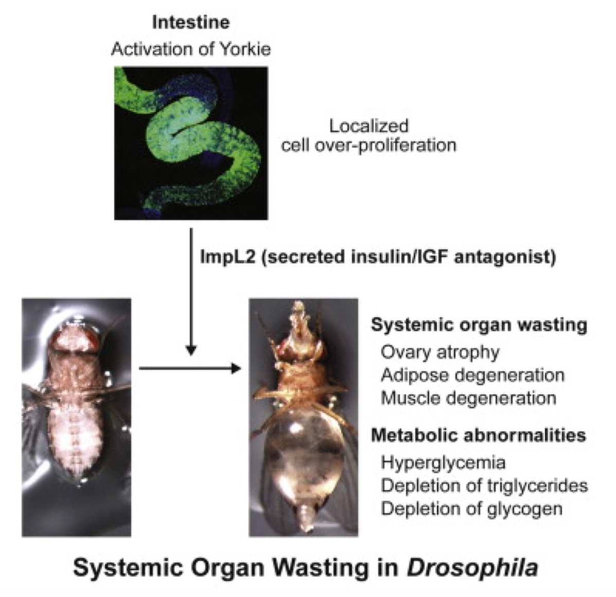 Just this month in the journal, Developmental Cell, two separate teams of investigators have published evidence pinpointing the major molecular culprit in this wasting disease and how it does what it does [1, 2]. Both teams used fruit flies as cancer models. The first team transplanted tumors into Drosophila in order to induce wasting, meanwhile the second group developed a genetic cancer model utilizing the fruit fly oncogene, Yorkie.