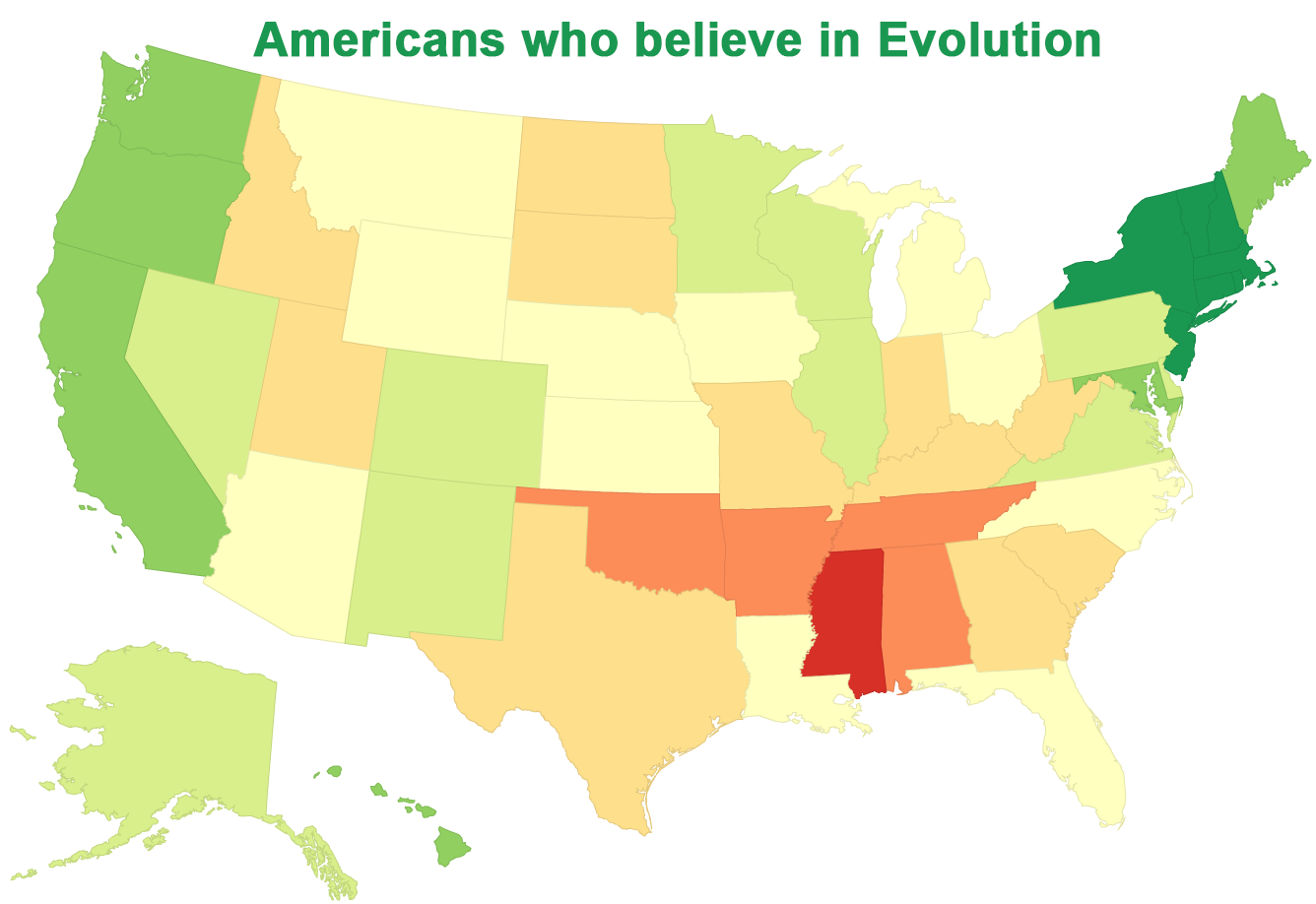 In the Enlightenment movement, Reason was bed partner to Science. Therefore, doesn’t it make more sense that the acceptance of the Theory of Evolution, for instance, is strongest in those locales that contain the top-ranked universities and were more quintessentially “bourgeois” during early America? As the Republican Party has taken up the mantle of Creationism, is it not also unsurprising that they have their strongest foothold in the bread basket of America?