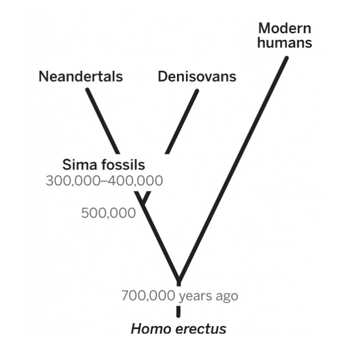 Recent genetic evidence reported by paleogeneticist, Matthias Meyer, of the Max Planck Institute suggests that the Sima people and Neandertals were indeed quite closely related; however, the Sima were less closely related to modern humans. Meyer suggests that the evidence supports an earlier split in time between the lines of Neandertal and modern human than was originally thought, perhaps even as long ago as 700,000 years, which is 100,000-400,000 years earlier than once believed.