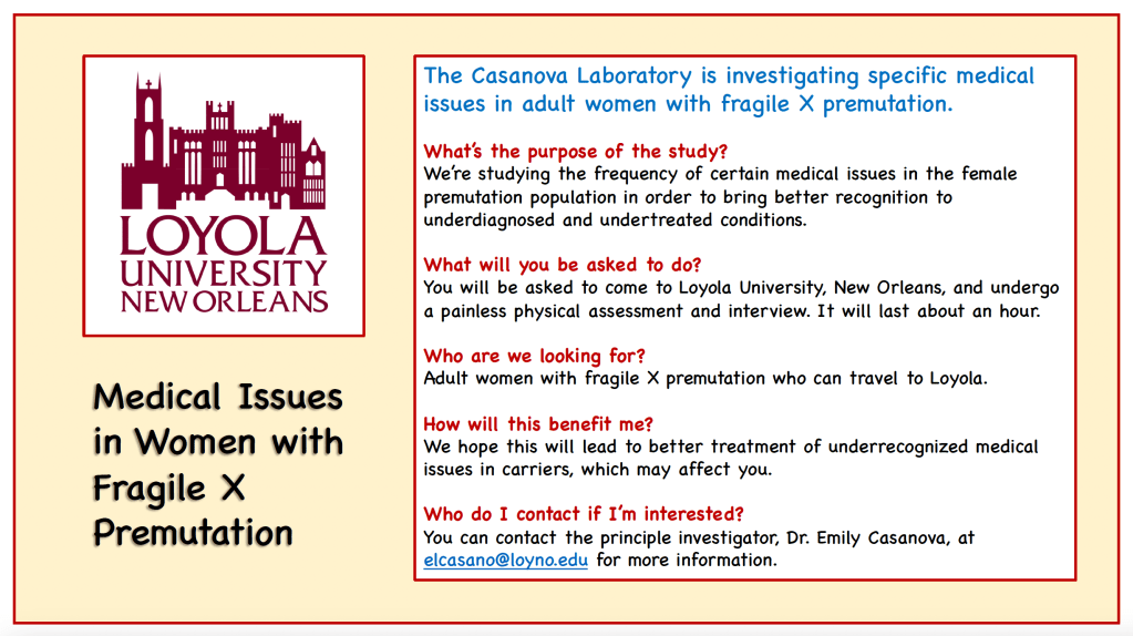 Many of you probably know me as a researcher who studies autism and/or Ehlers-Danlos syndromes. However, I also study a related spectrum of conditions known as Fragile X Syndrome and Fragile X Premutation. I am actively recruiting for an ongoing study investigating certain medical issues in women with the premutation in the hopes we can learn more about how often these conditions are occurring in this population, whether they are associated with certain genetic variations (repeat numbers), and ultimately how we can better improve the quality of life of premutation carriers.